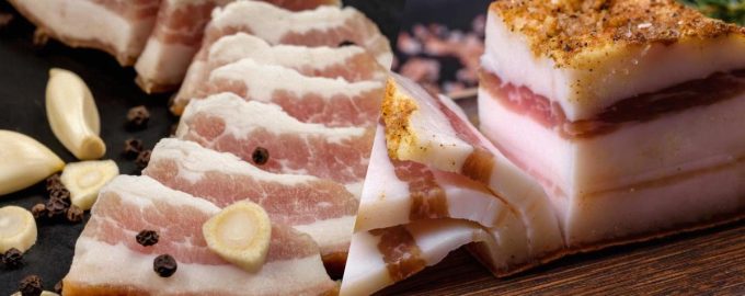 Späckbiten ska tvättas och torkas med servetter. Skär det i stora bitar. Skala vitlöken och hacka den också grovt. Hälften av det ska hällas på botten av skålen, lägg sedan ister och strö över resten av vitlök.