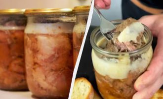 Tvätta köttet, skär det i medelstora bitar och salta det. Fördela två eller tre ärtor peppar och ett lagerblad i rena burkar. Lägg sedan köttet tätt i burkarna.